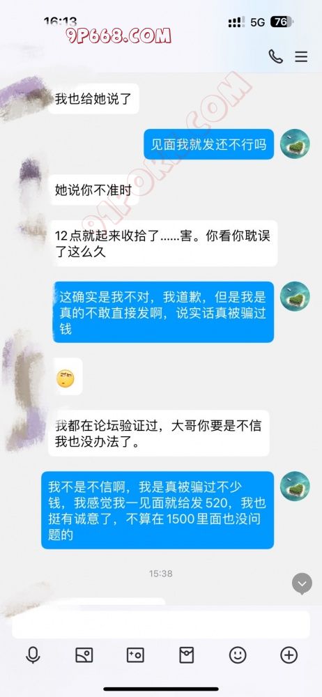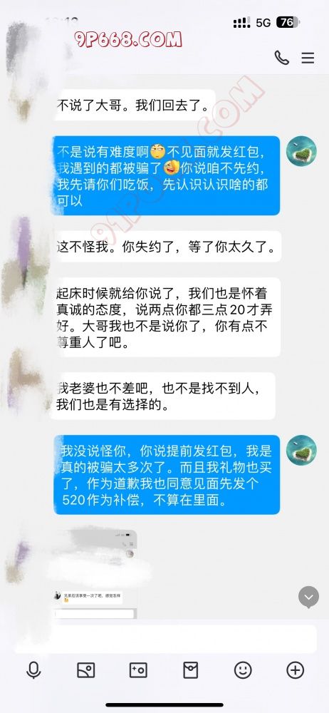 前段时间在论坛里看到一对夫妻,门槛88,有偿。加上以后聊了聊,也聊的挺好,过了门槛,也提前给准备了个几百块钱的小礼物。然后本来定的两点左右,我确实有点事耽搁了,我也给他们说了,让他们等一等,他们也同意了。结果我开好了房间,说是让我先给发个520红包。。。我不同意不见面就发红包,我的意思是,作为我临时有事耽误了一小时的时间,我可以等见面先给发520的红包作为补偿,另外1500另算,前提是先见面,而且我也说可以先在路上见见。他们不同意,要求必须先发红包,最后不欢而散。